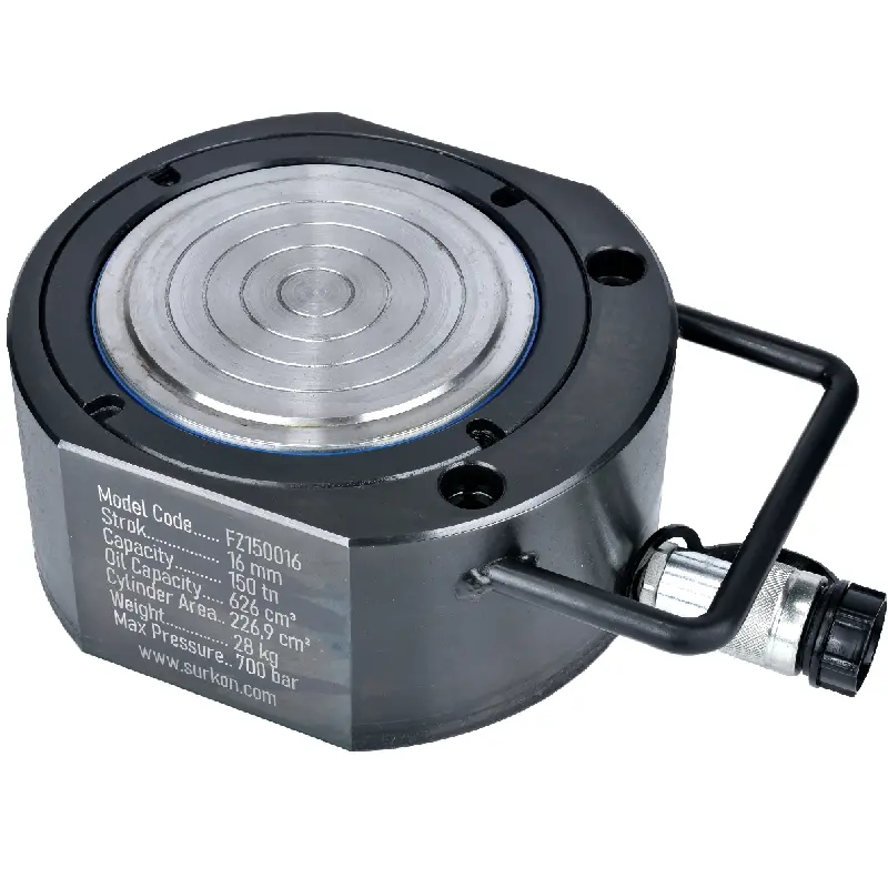 Surkon FZ serisi hidrolik krikolar, 5 ila 150 ton kapasite aralığı ile ağır iş koşullarında üstün performans gösterir. Ultra yassı ve hafif yaprak tasarımı sayesinde, dar ve zorlu çalışma alanlarında kullanım için idealdir. 11, 14, 16 ve 25 mm strok boyları seçenekleriyle çeşitli uygulamalara uyum sağlar.