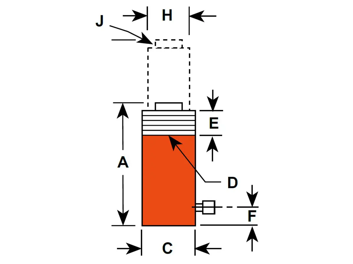 | Model | Kapasite | Strok | Etki Alanı | Yağ Hacmi | Kapalı Boy | Dış Çap | Rot Çapı | Kaplin Mesafesi | E | D | J | Ağırlık |